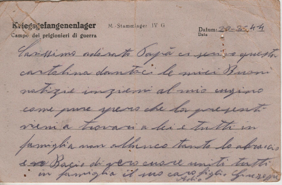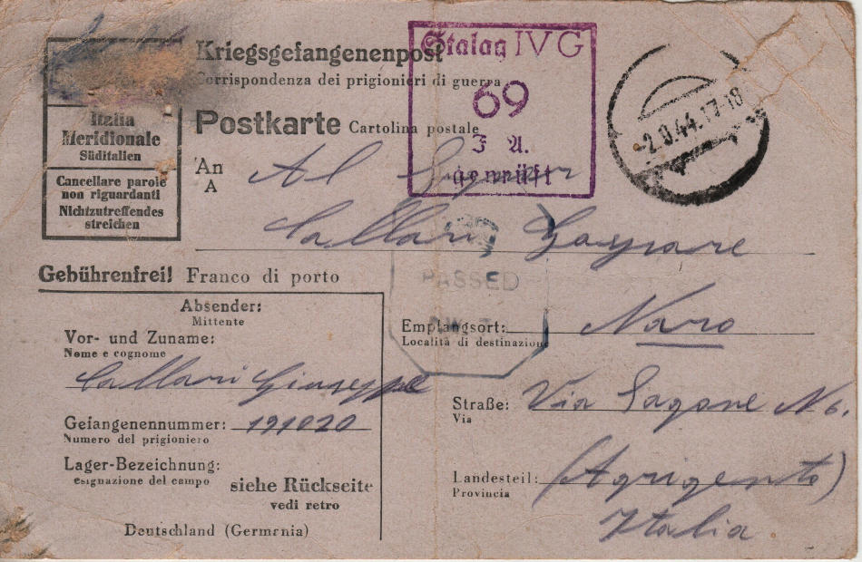 Cartolina scritta il 20.8.1944 nel campo di prigionia e spedita a Naro, provincia di Agrigento (Italia)
