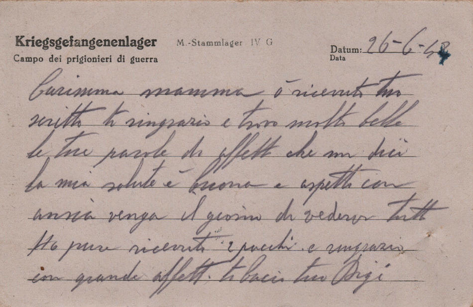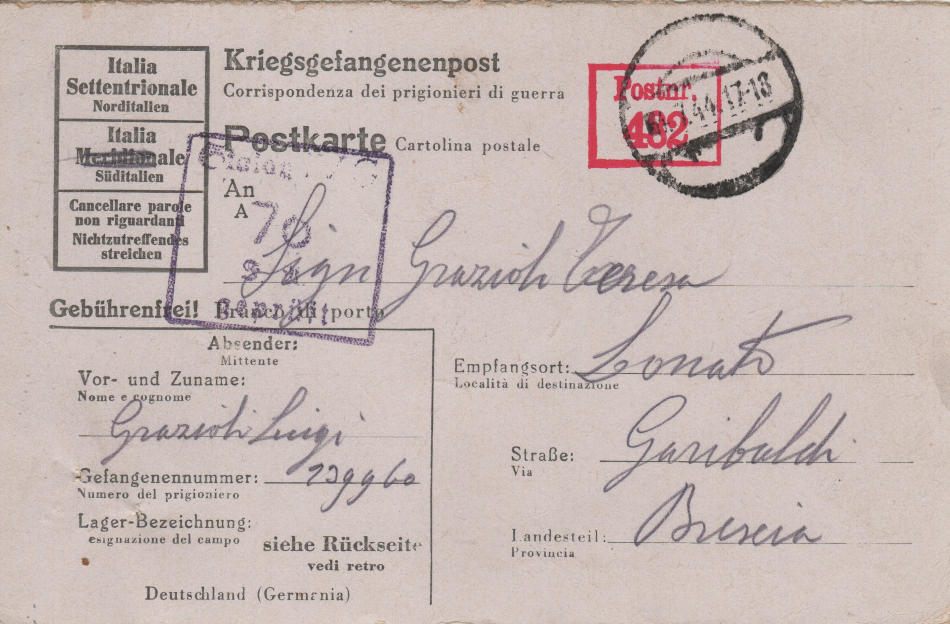 Cartolina scritta il 26.6.1944 nel campo di prigionia e spedita a Lonato, provincia di Brescia (Italia)