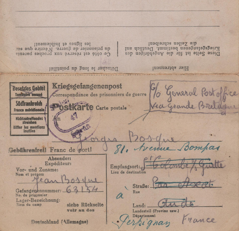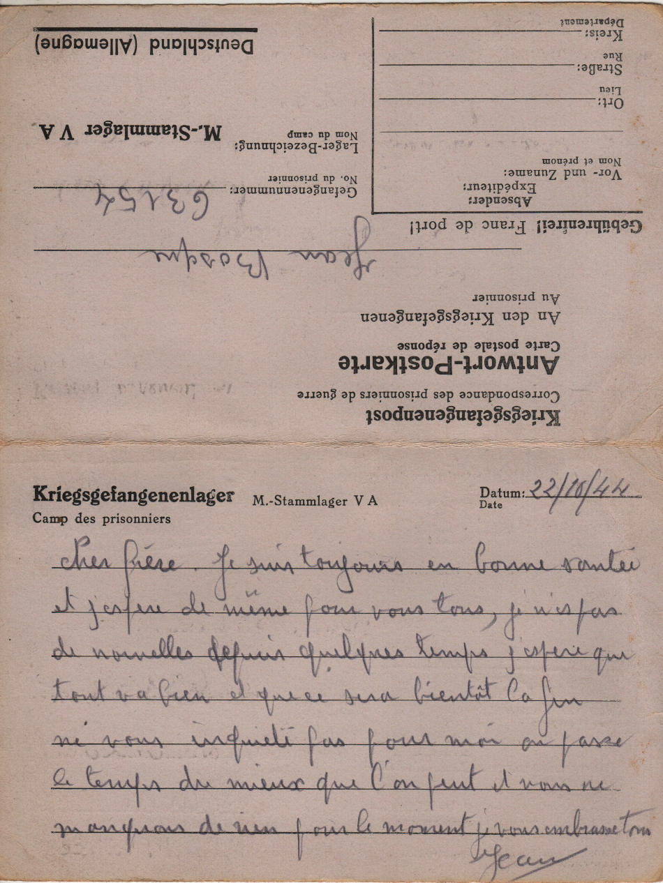 Cartolina scritta il 22.10.1944 nel campo di prigionia e spedita a Sainte-Colombe-sur-Guette, dipartimento dell’Aude (Francia)