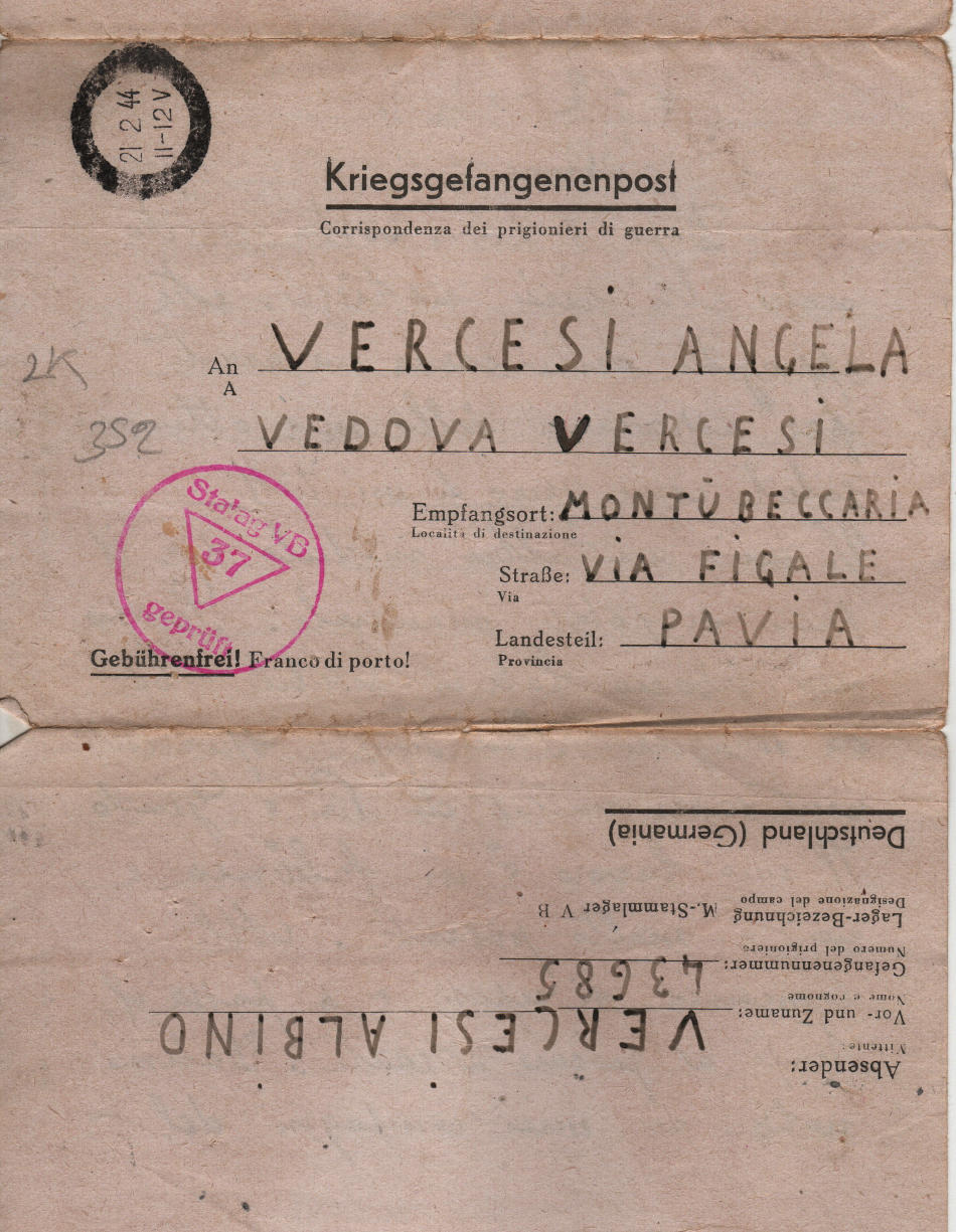 Lettera scritta il 7.2.1944 nel campo di prigionia e spedita a Montù Beccaria (provincia di Pavia) in Italia