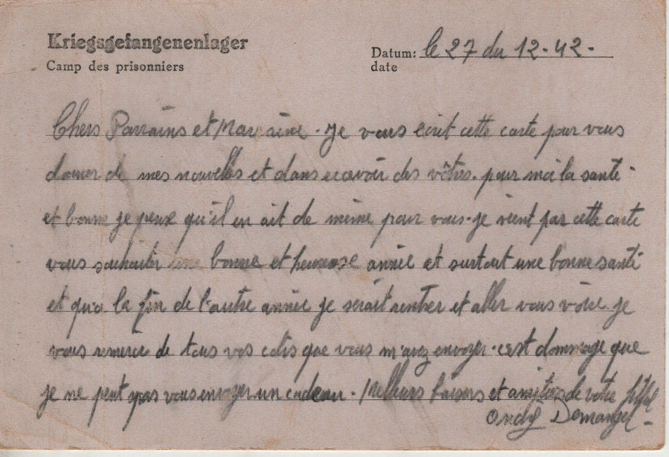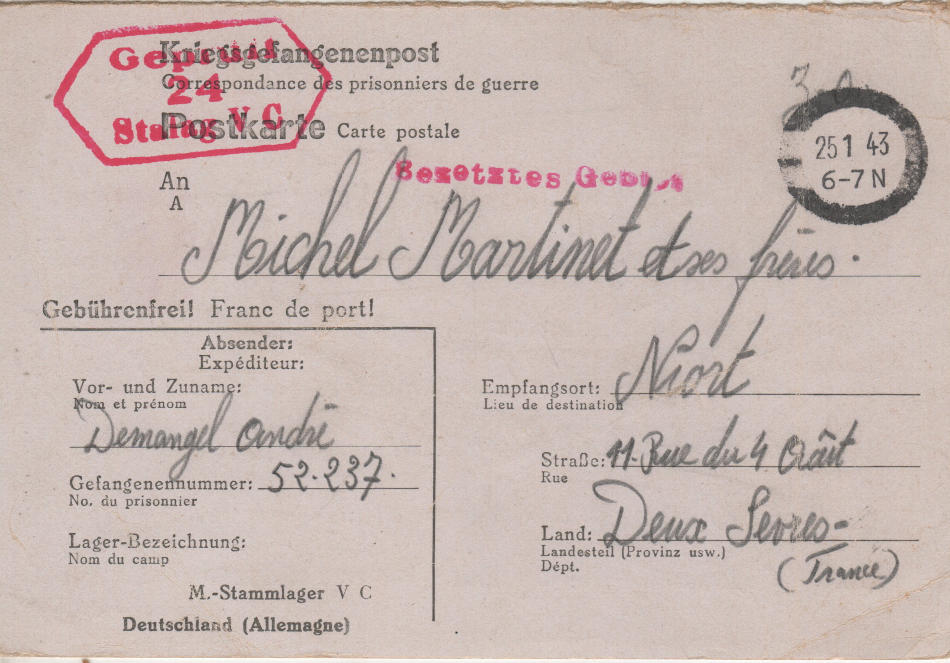 Cartolina scritta il 27.12.1942 nel campo di prigionia e spedita a Niort, regione della Nuova Aquitania (Francia)