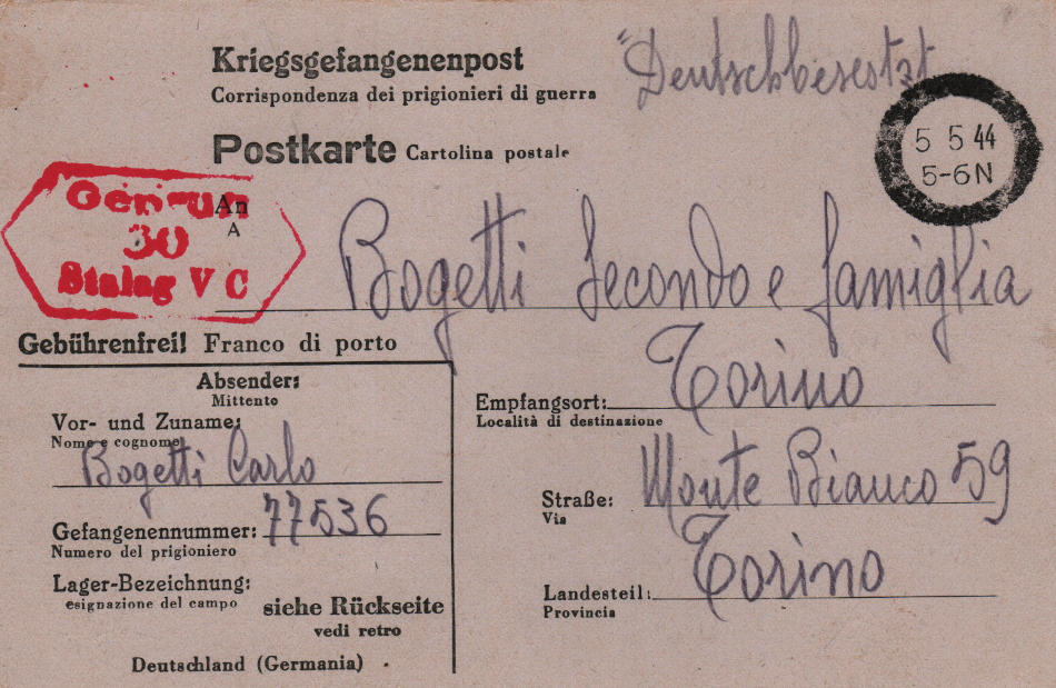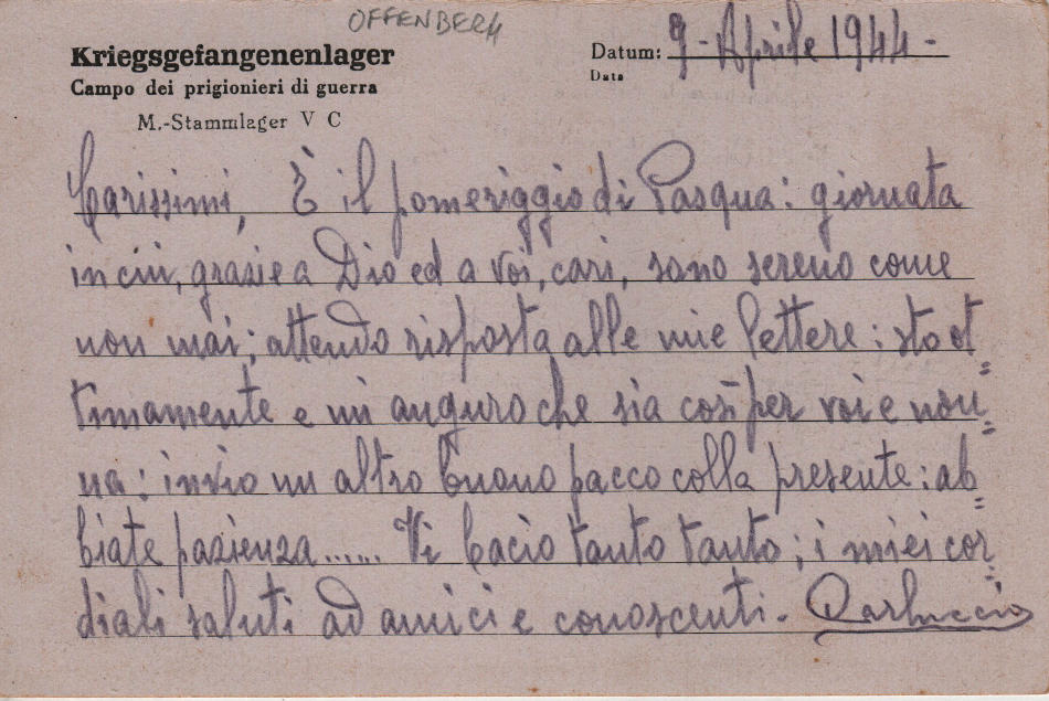 Cartolina scritta il 9.4.1944 nel campo di prigionia e spedita a Torino in Italia