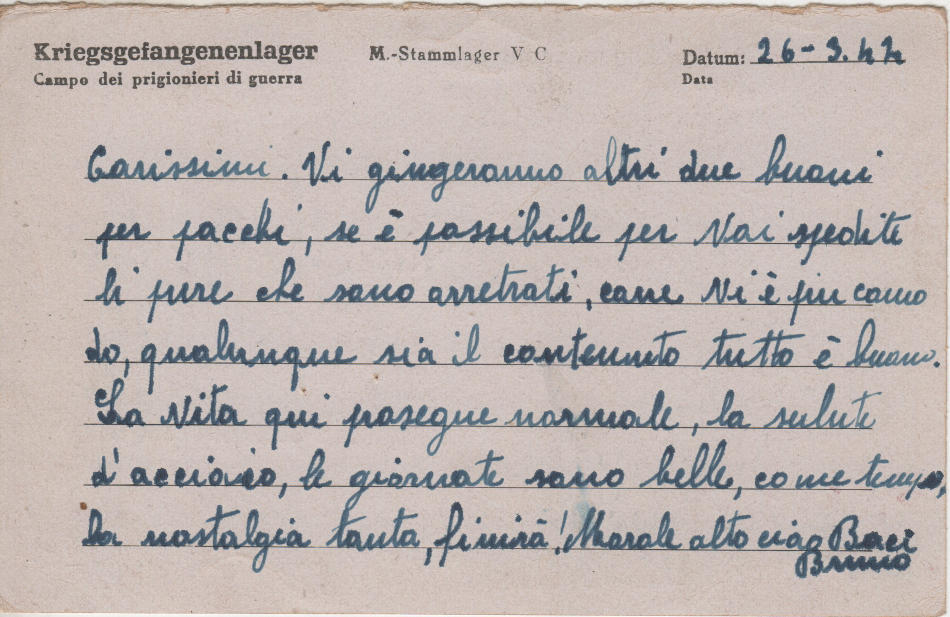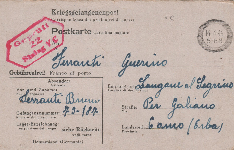 Cartolina scritta il 26.3.1944 nel campo di prigionia e spedita a Longone al Segrino, provincia di Como (Italia)