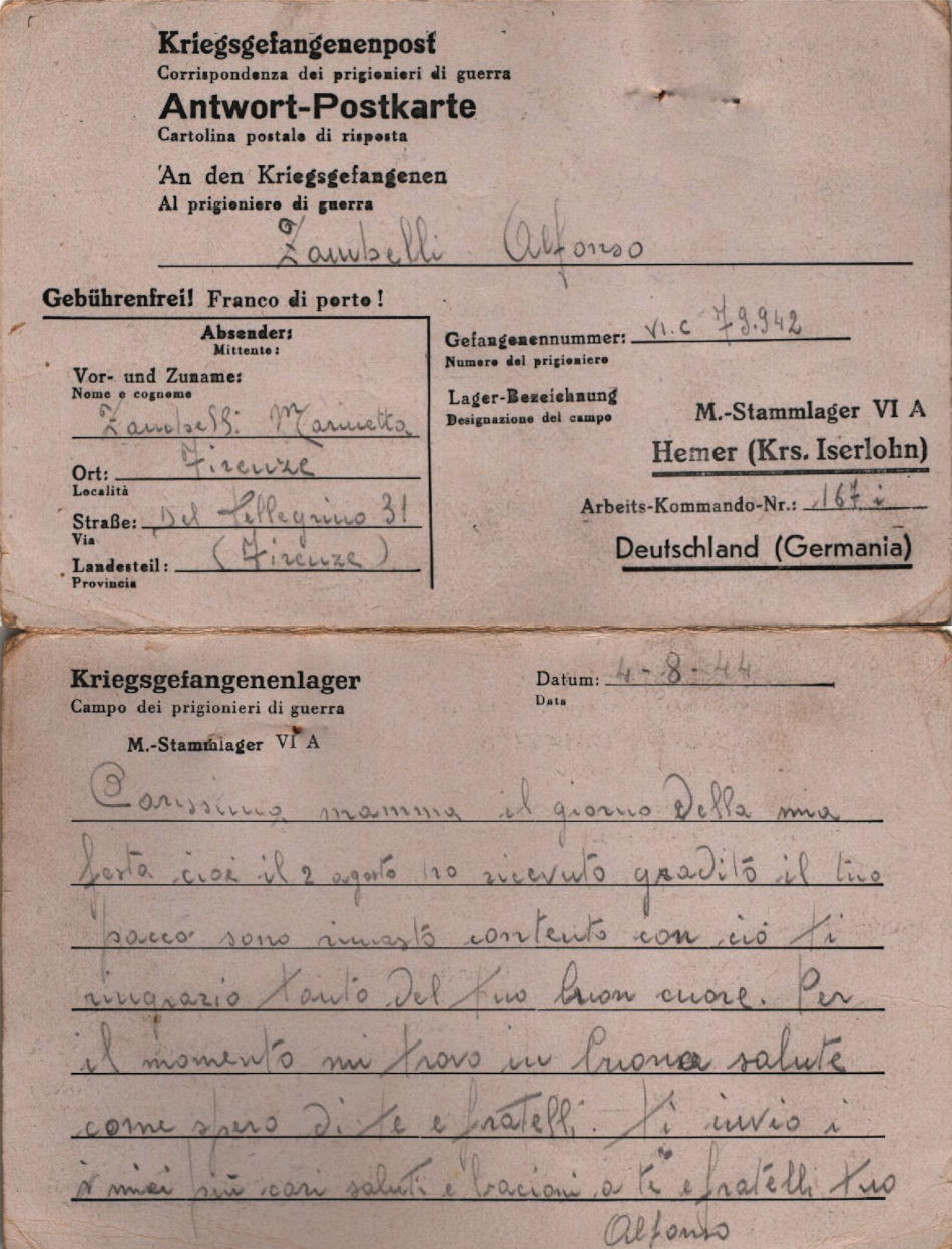 Cartolina scritta il 4.8.1944 nel campo di prigionia e spedita a Firenze (Italia)