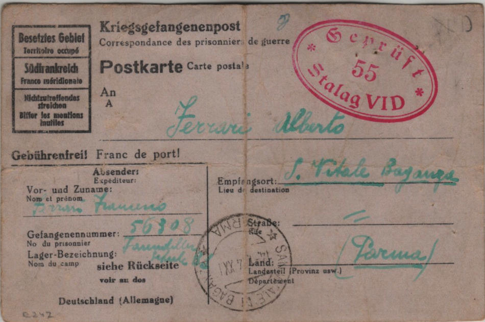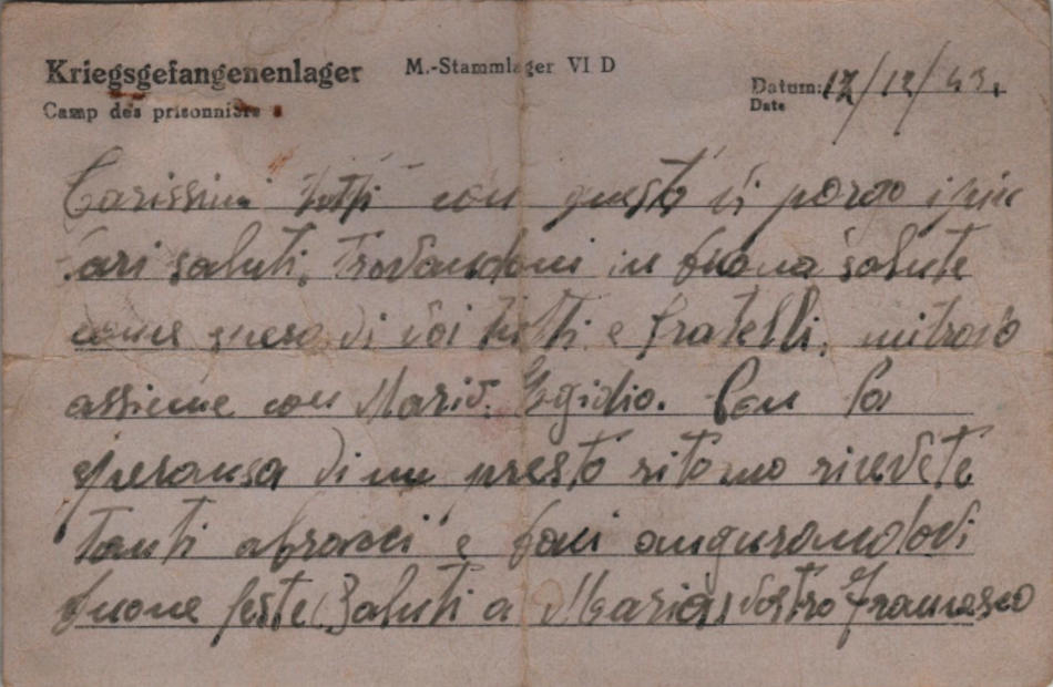 Lettera scritta il 17.12.1943 nel campo di prigionia e spedita a San Vitale Baganza, provincia di Parma (Italia)