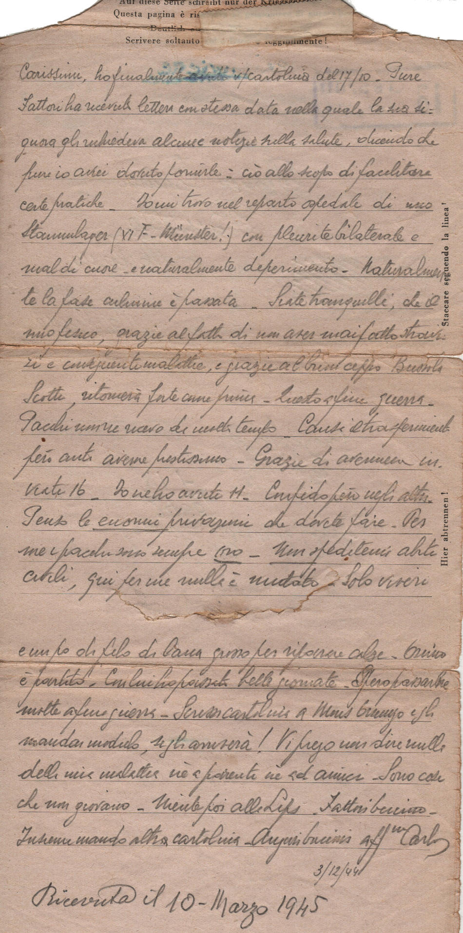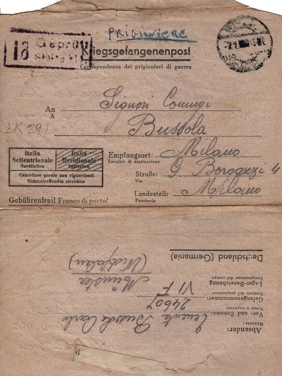 Lettera scritta il 3.12.1944 nel campo di prigionia e spedita a Milano in Italia