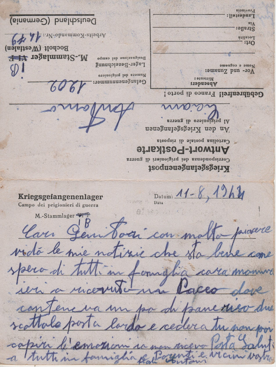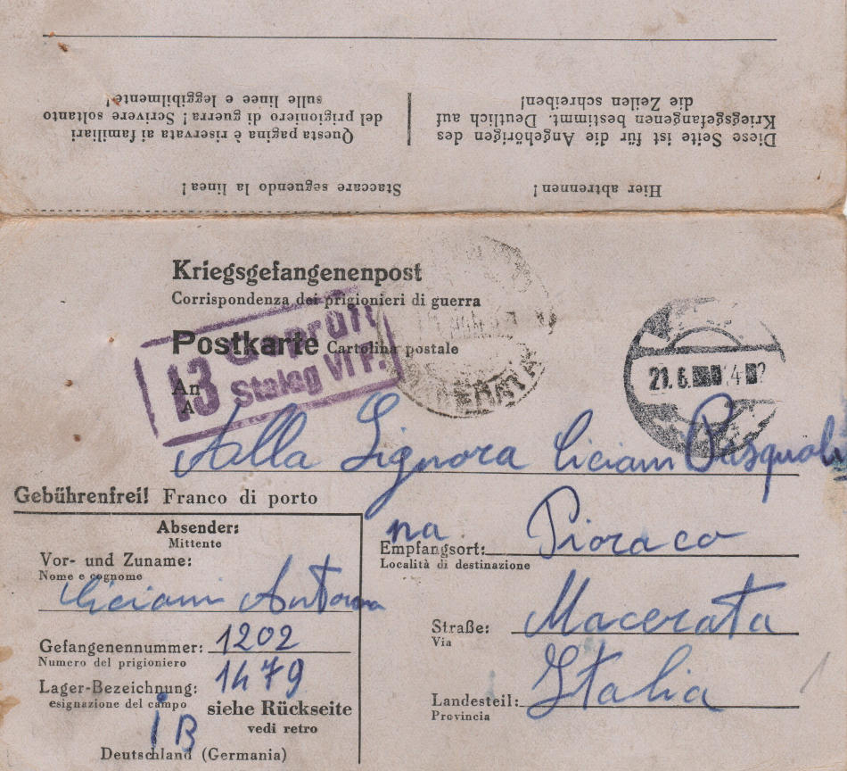 Cartolina scritta il 11.8.1944 nel campo di prigionia e spedita a Pioraco, provincia di Macerata (Italia)