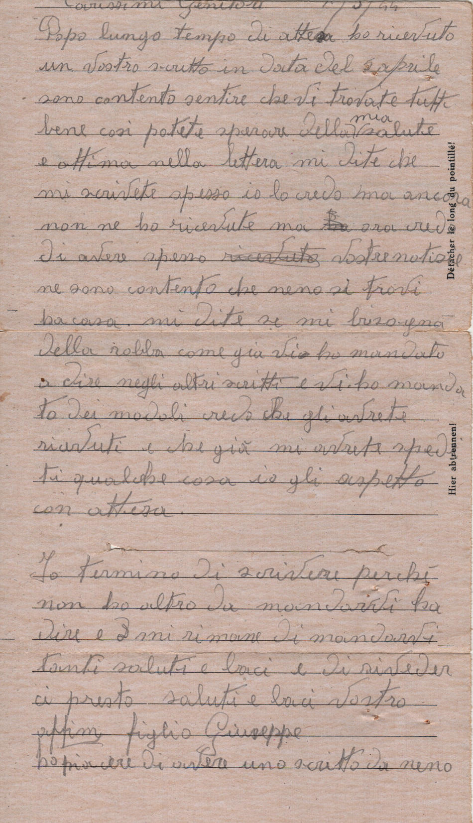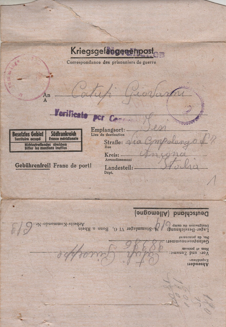 Lettera scritta il 7.5.1944 nel campo di prigionia e spedita a Jesi, provincia di Ancona (Italia)