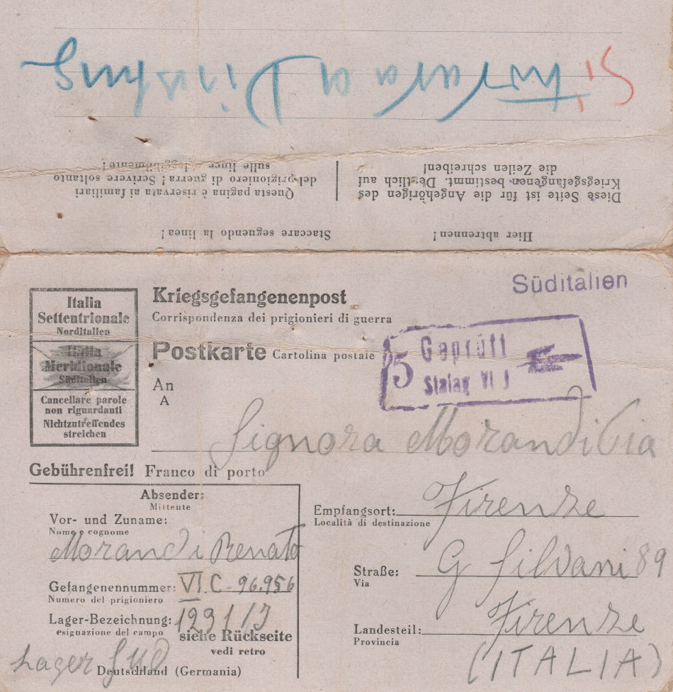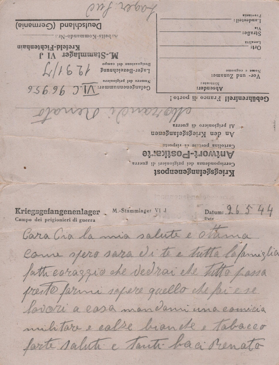 Cartolina scritta il 26.5.1944 nel campo di prigionia e spedita a Firenze (Italia)