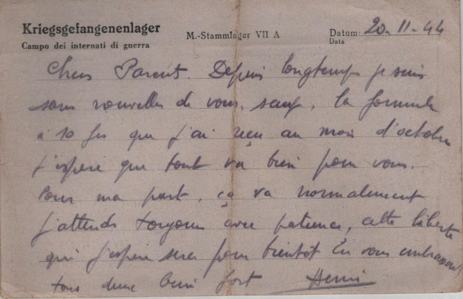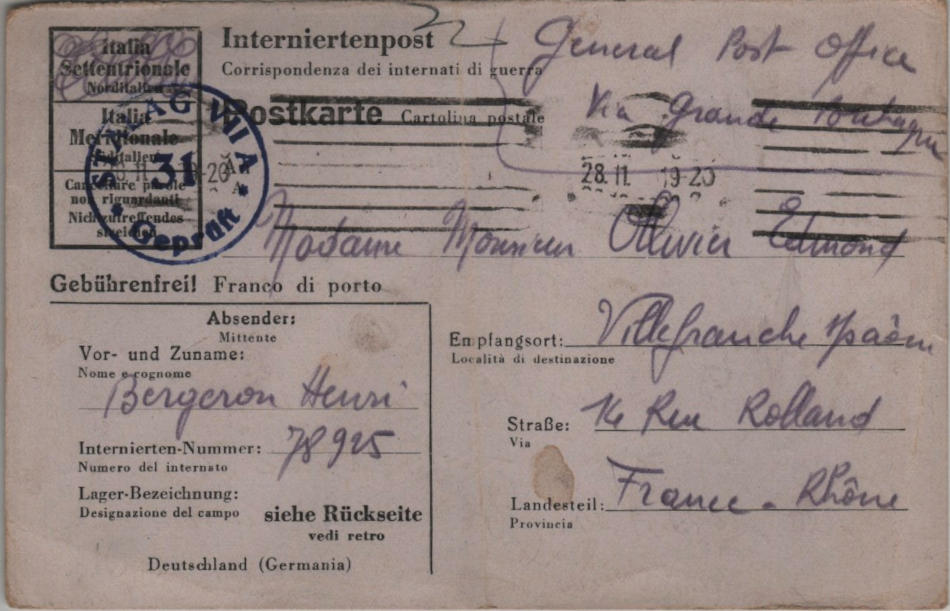 Cartolina scritta il 20.11.1944 nel campo di prigionia e spedita a Villefranche sur Saone, dipartimento del Rodano (Francia)