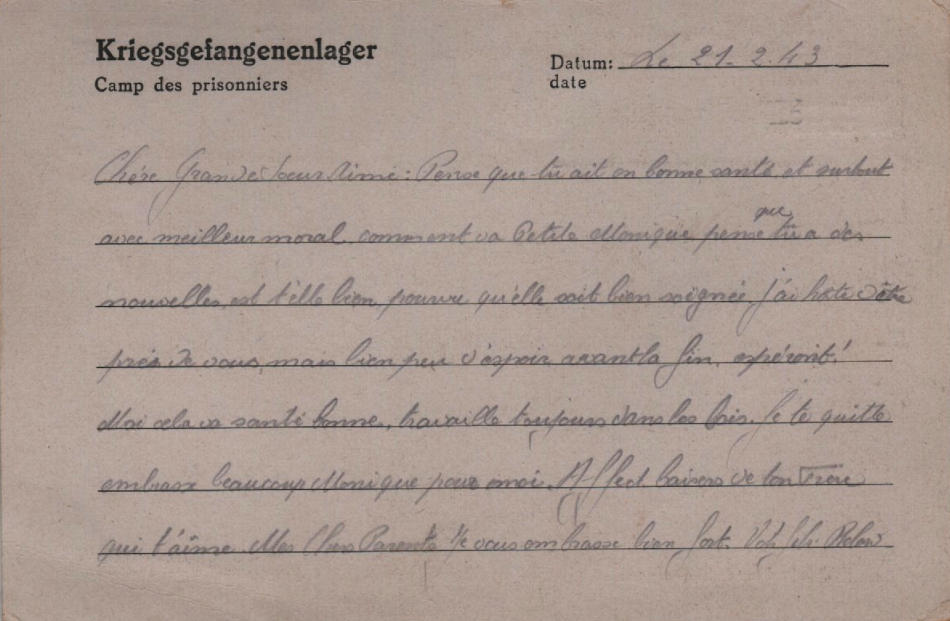 Cartolina scritta il 21.2.1943 nel campo di prigionia e spedita a Asnières-sur-Seine in Francia