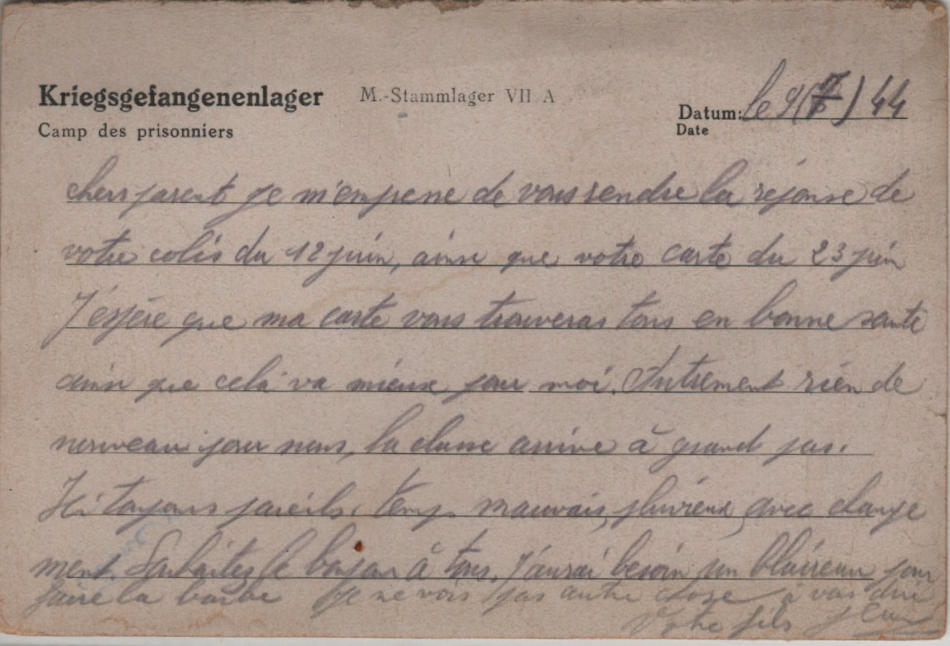 Cartolina postale scritta il 9.7.1944 nel campo di prigionia e spedita a Parigi (Francia)