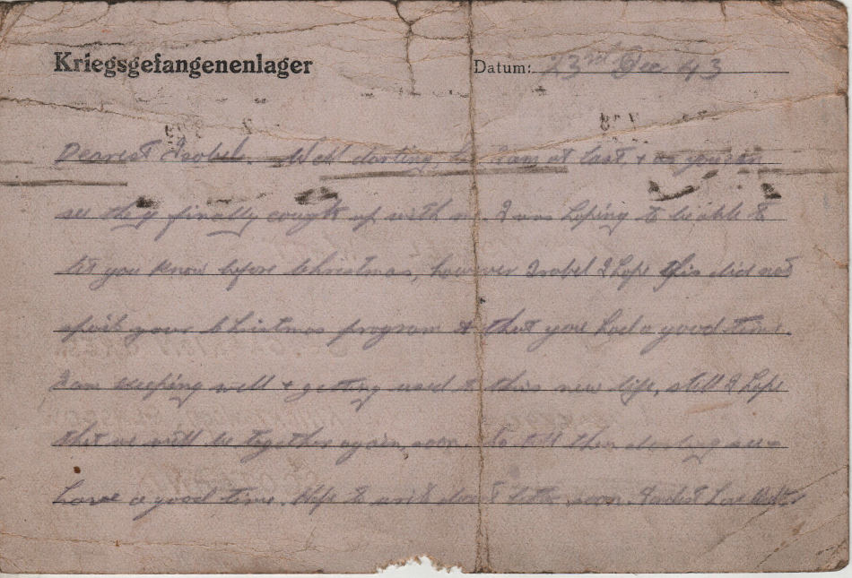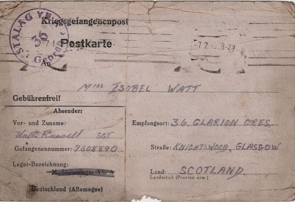Cartolina scritta nel campo di prigionia e inviata a Knightswood (Glasgow) in Scozia, Regno Unito