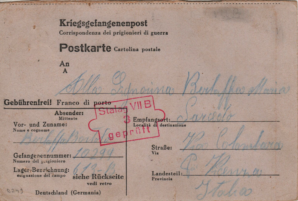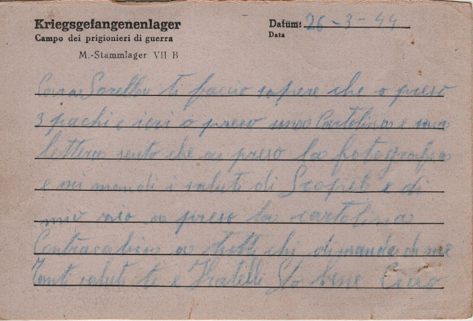 Cartolina scritta il 26.3.1944 nel campo di prigionia e spedita a Sarcedo, provincia di Vicenza (Italia)