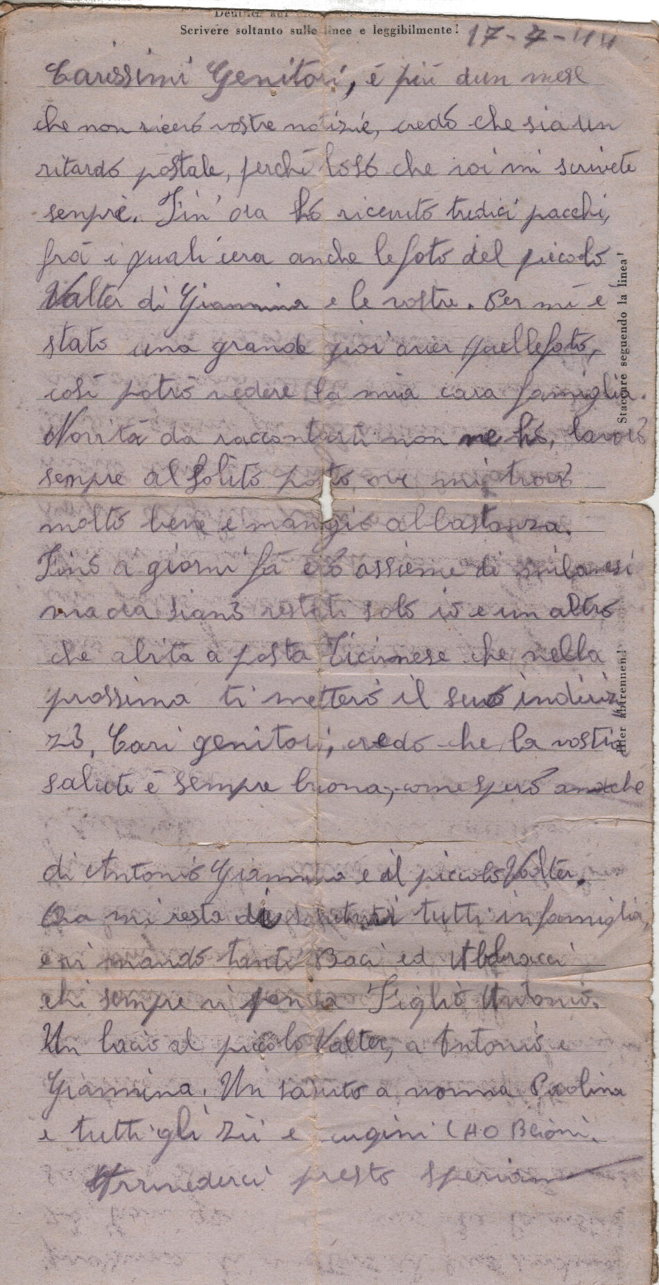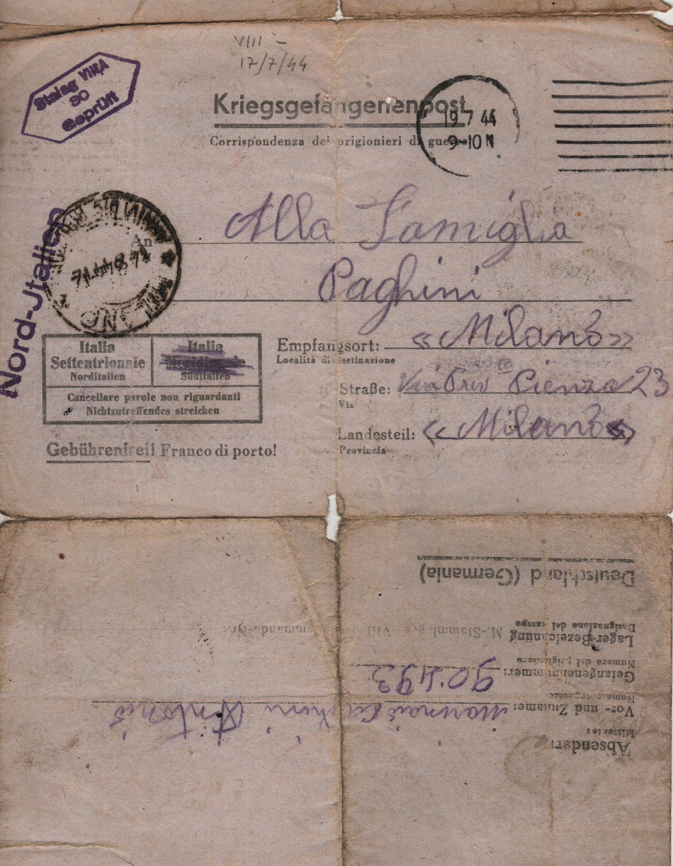 Lettera scritta il 17.7.1944 nel campo di prigionia e spedita a Milano (Italia)