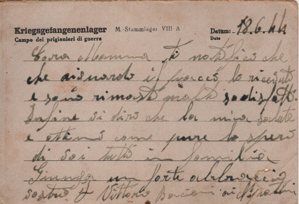 Cartolina scritta il 18.6.1944 nel campo di prigionia e spedita a Correggio, provincia di Reggio Emilia (Italia)