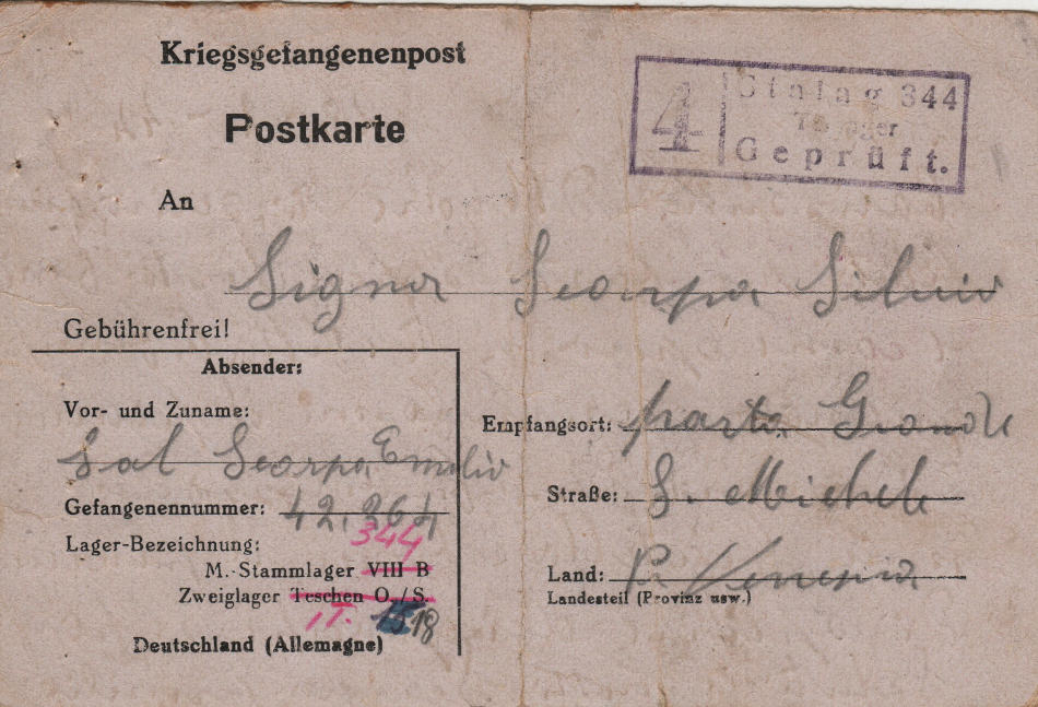 Cartolina scritta il 28.2.1944 nel campo di prigionia e spedita in provincia di Venezia (Italia)