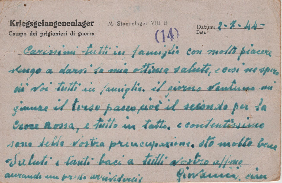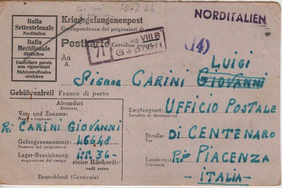 Cartolina scritta il 2.7.1944 nel campo di prigionia e inviata a Centenaro, provincia di Piacenza (Italia)