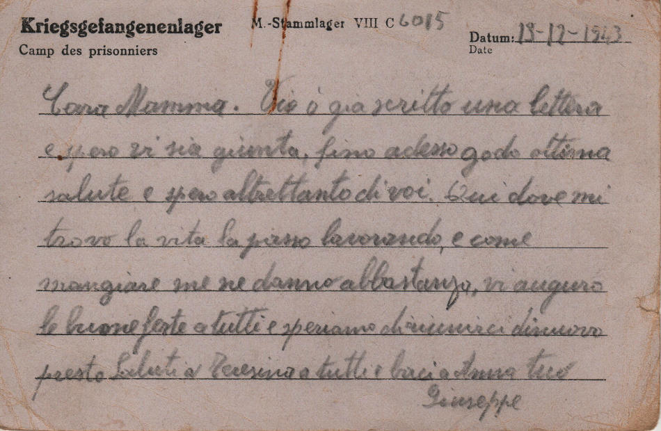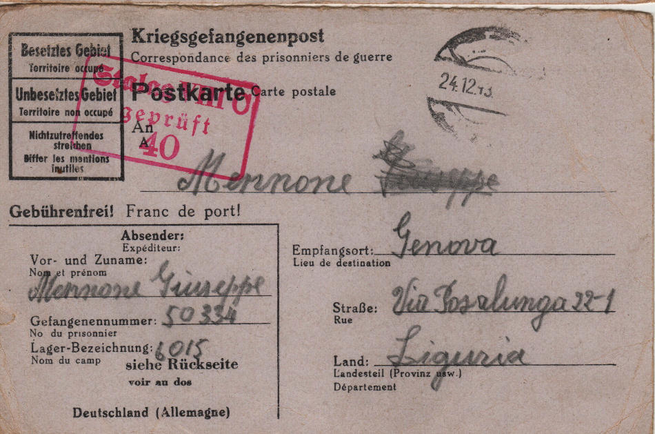 Cartolina scritta il 13.12.1943 nel campo di prigionia e spedita a Genova (Italia)