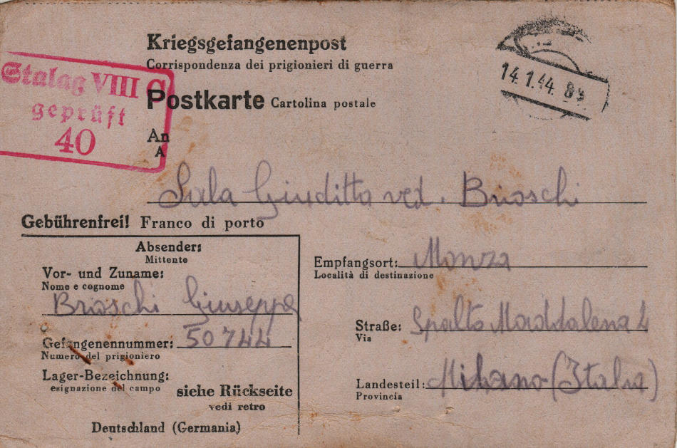 Cartolina scritta il 9.1.1944 nel campo di prigionia e spedita a Monza, allora provincia di Milano (Italia)
