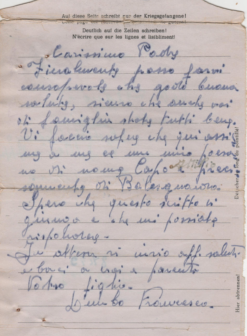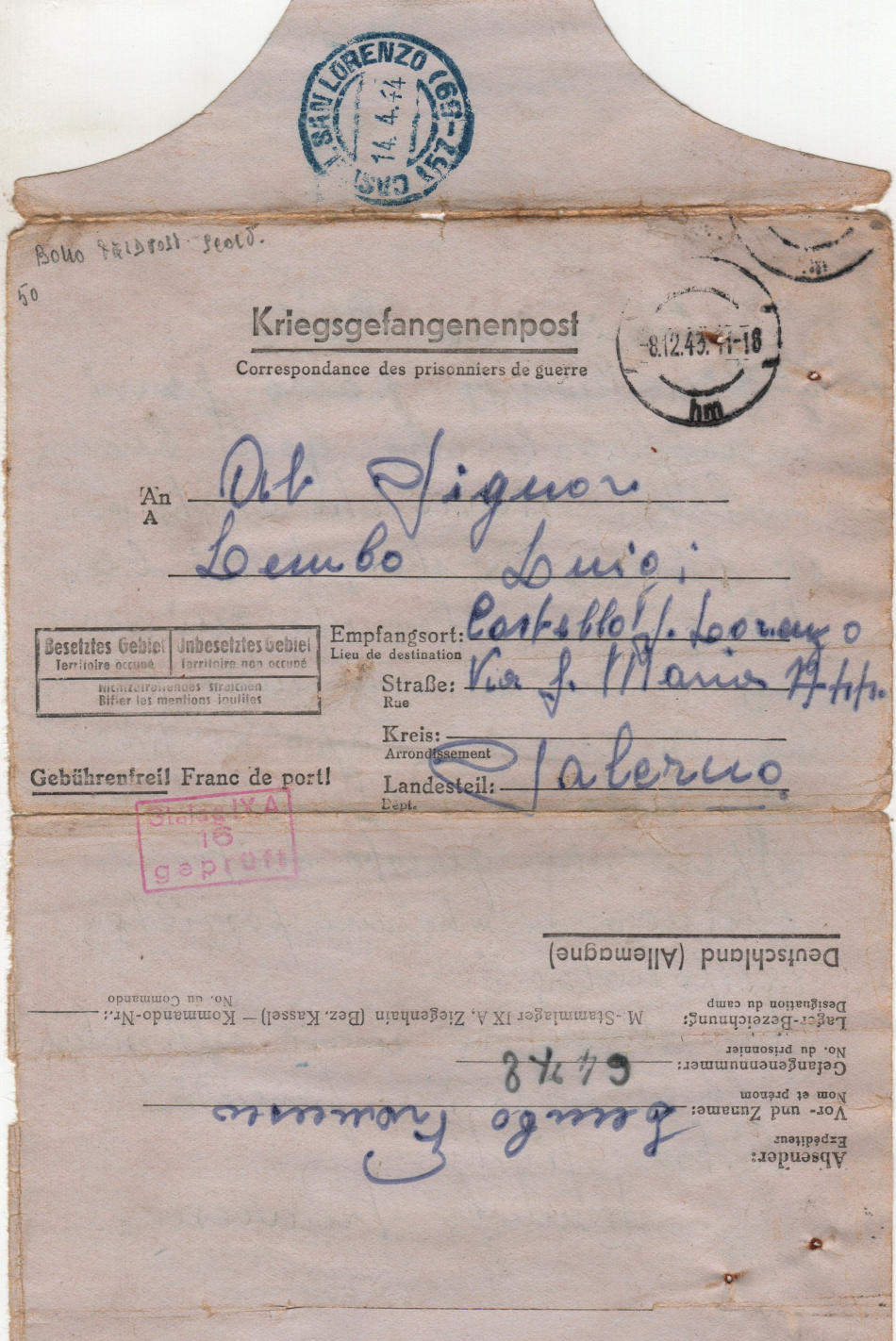 Lettera scritta nel campo di prigionia e spedita (data postale 8.12.1943) a Castel San Lorenzo, provincia di Salerno (Italia)