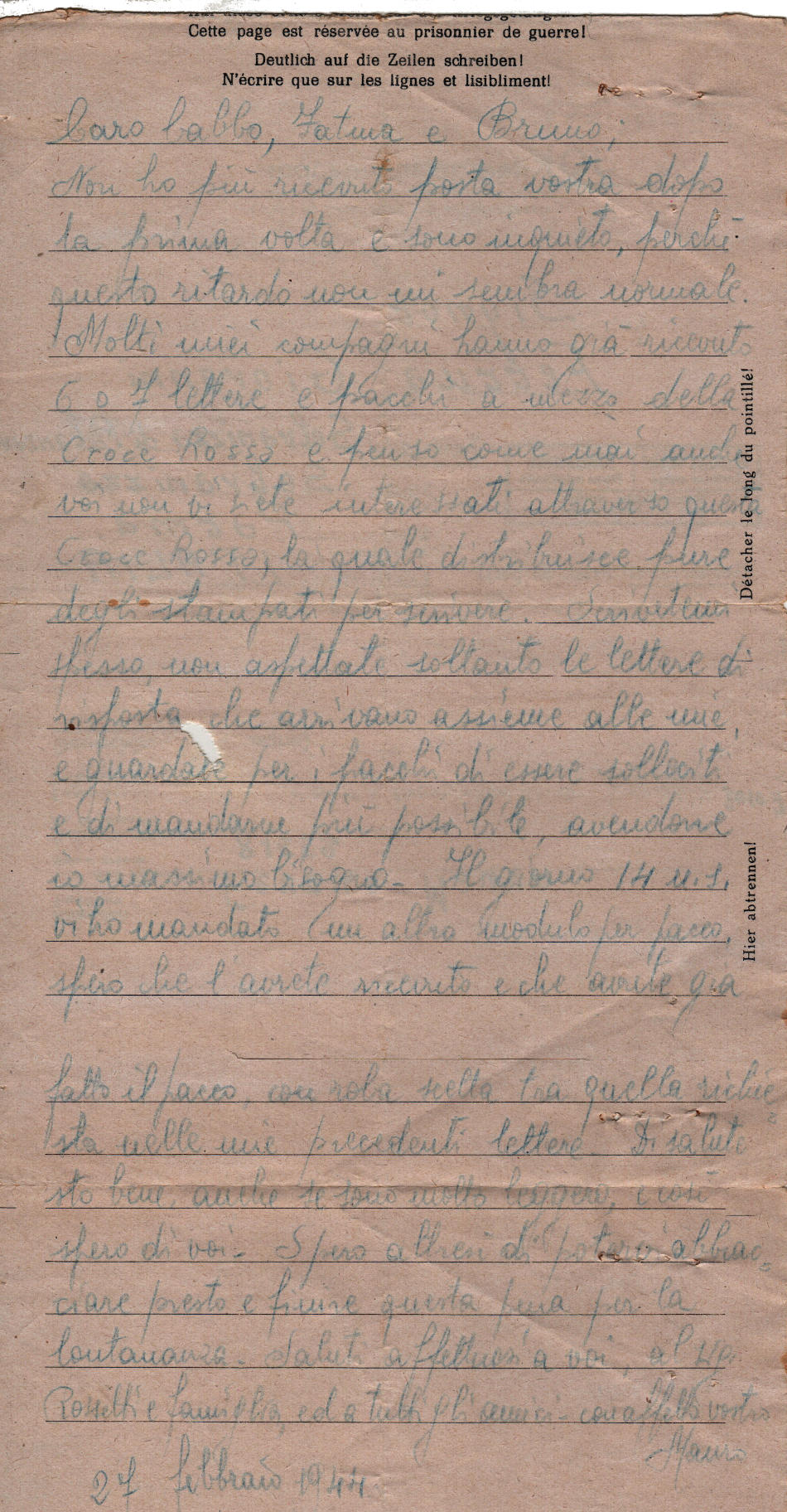 Lettera scritta il 27.2.1944 nel campo di prigionia e spedita a Selvanizza di Palanzano (provincia di Parma) in Italia