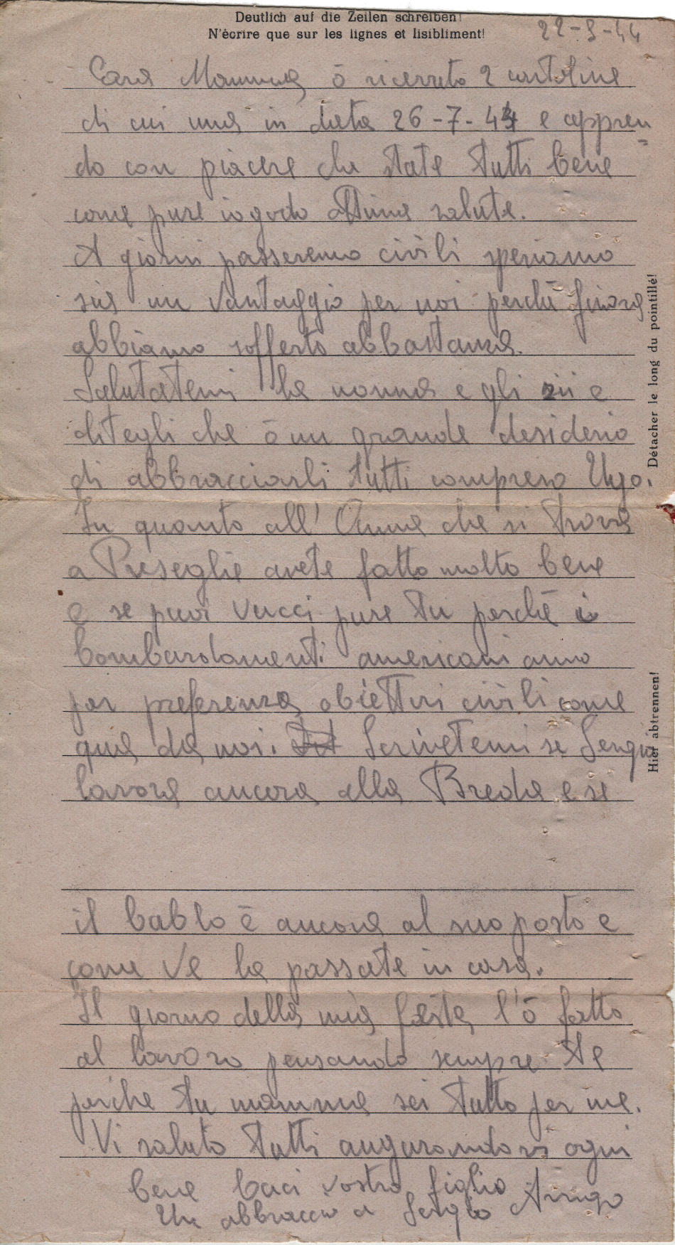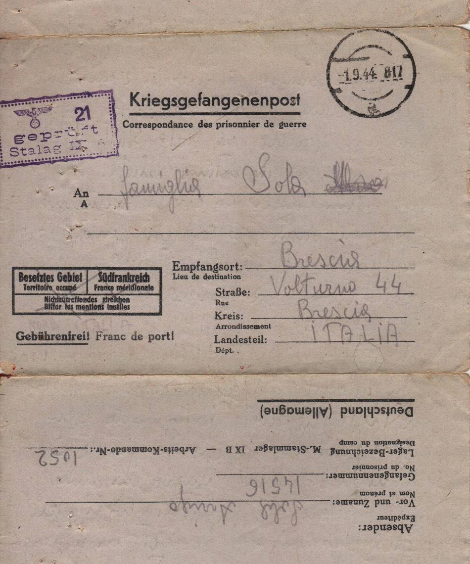 Lettera scritta il 22.8.1944 nel campo di prigionia e spedita a Brescia in Italia