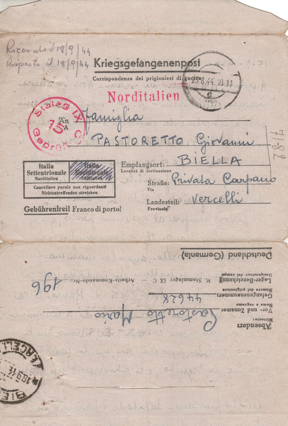 Lettera scritta il 15.8.1944 nel campo di prigionia e spedita a Biella in Italia