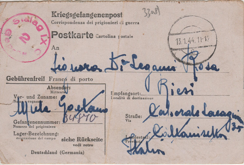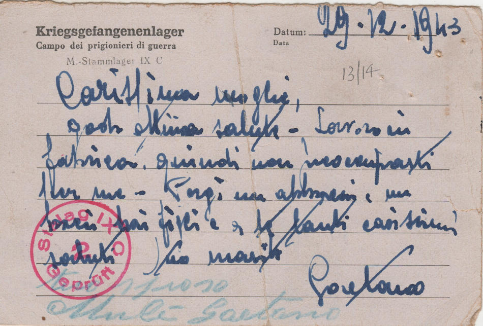 Cartolina scritta il 29.12.1943 nel campo di prigionia e spedita in Italia a Riesi (provincia di Caltanissetta)
