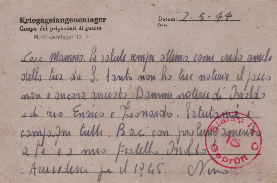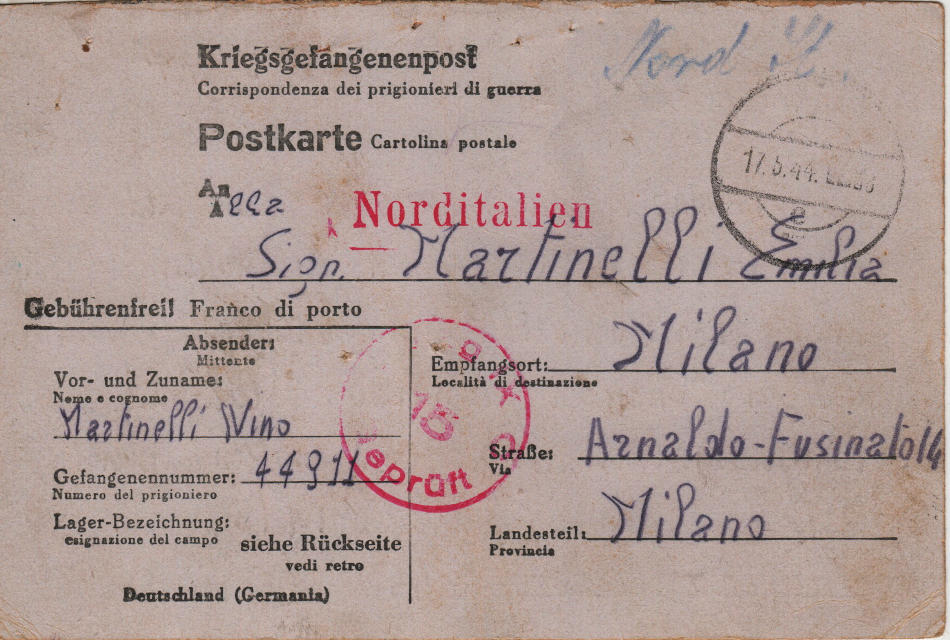 Cartolina scritta il 2.5.1944 nel campo di prigionia e spedita in Italia a Milano