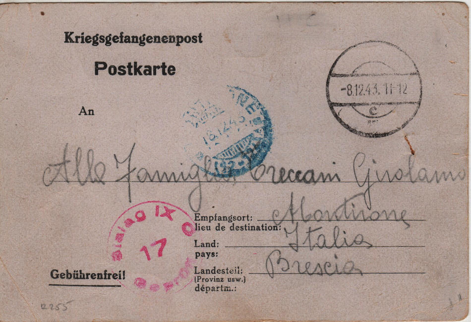 Cartolina precompilata scritta il 7.12.1943 nel campo di prigionia e spedita a Montirone (provincia di Brescia) in Italia