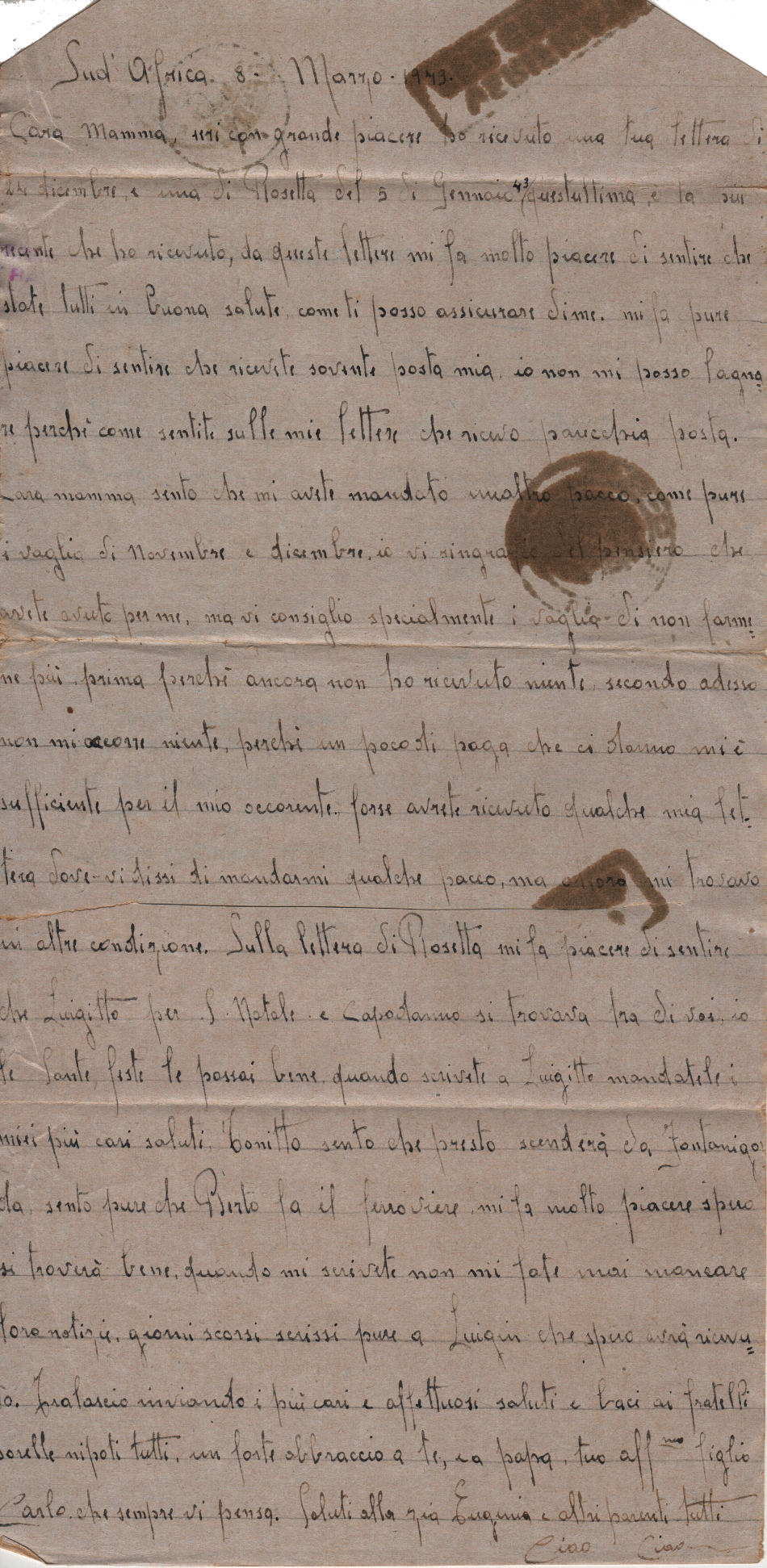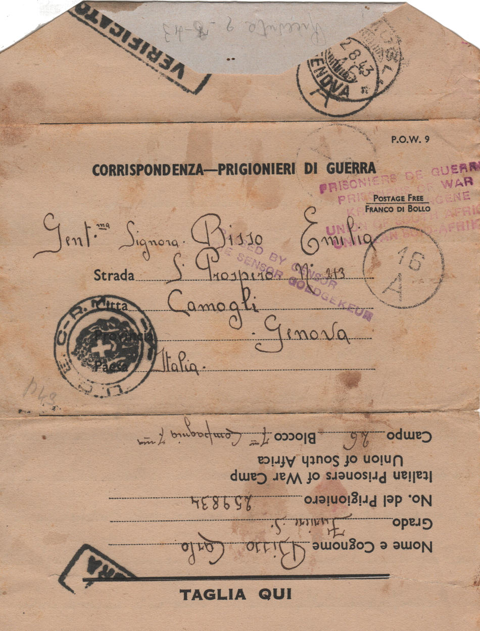 Lettera scritta l’8.3.1943 nel campo di prigionia e spedita a Camogli, in provincia di Genova, Italia