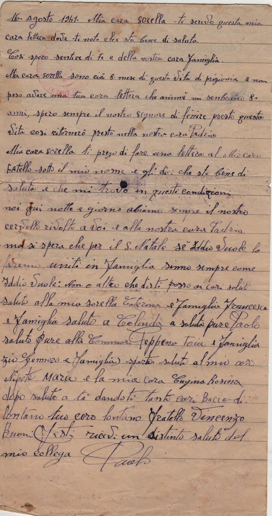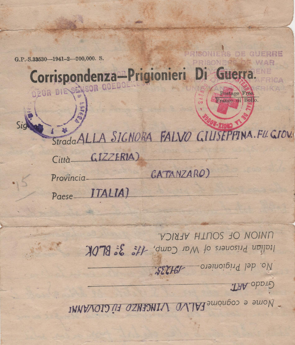 Lettera scritta il 16.8.1941 nel campo di prigionia e spedita a Gizzeria, in provincia di Catanzaro, Italia