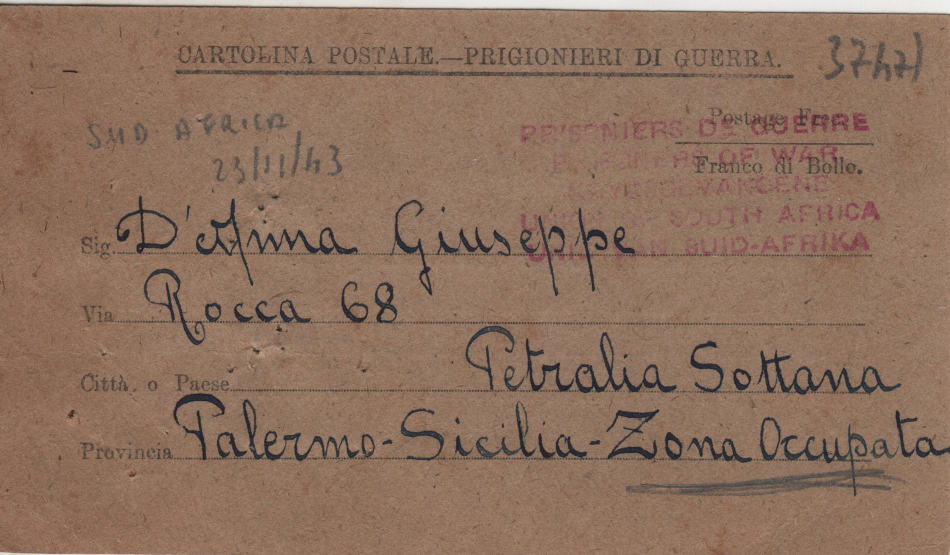 Cartolina scritta il 23.11.1943 nel campo di prigionia e spedita a Petralia Sottana in provincia di Palermo, Italia