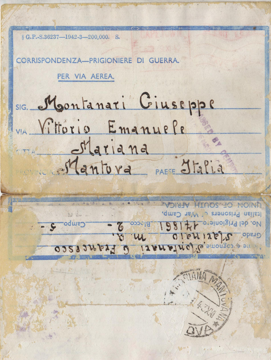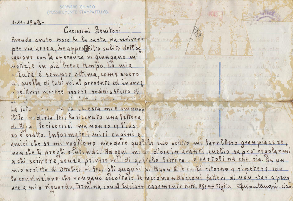 Lettera scritta il 1.11.1942 nel campo di prigionia e spedita a Mariana (Mantovana), in provincia di Mantova, Italia