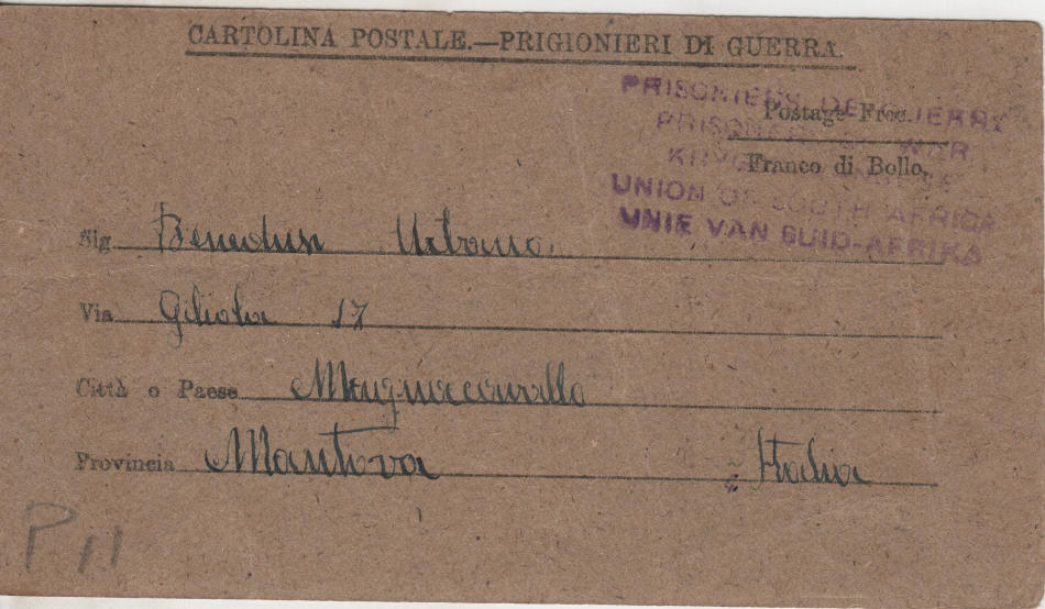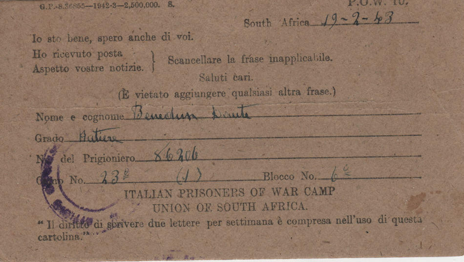 Cartolina scritta il 19.2.1943 nel campo di prigionia e spedita a Magnacavallo (provincia di Mantova) in Italia