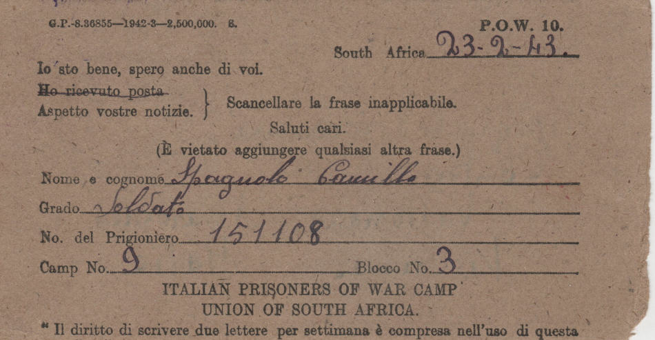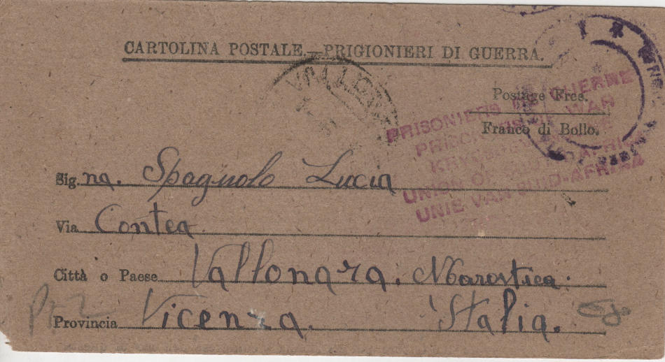 Cartolina scritta il 23.2.1943 nel campo di prigionia e spedita a Vallonara (Marostica) in provincia di Vicenza (Italia)