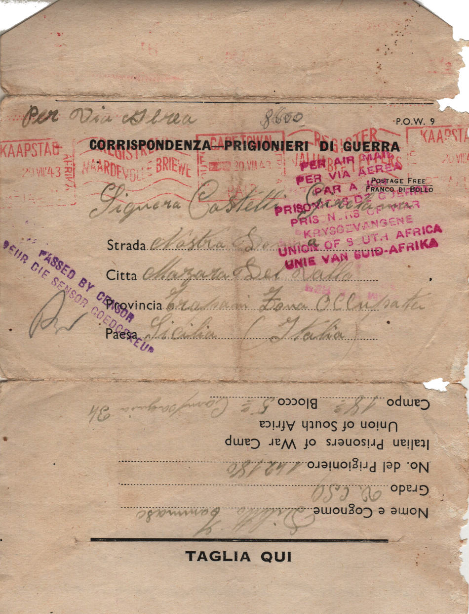 Lettera scritta il 14.8.1943 nel campo di prigionia e spedita a Mazara del Vallo (provincia di Trapani) in Italia