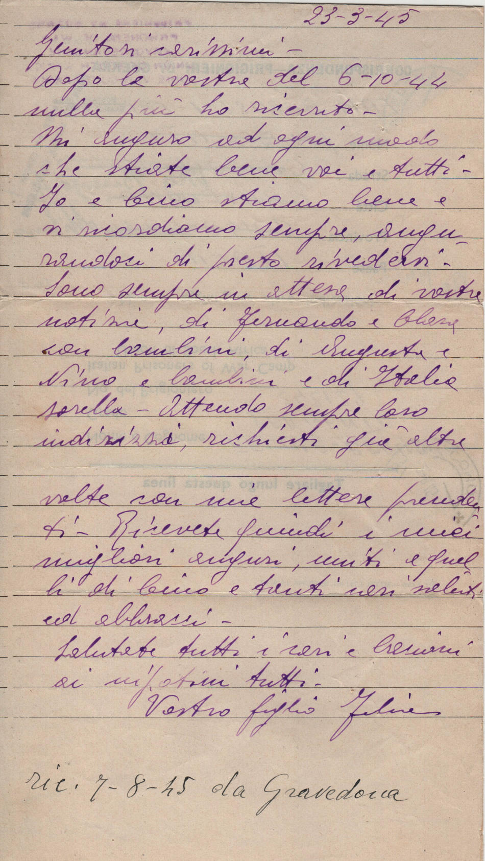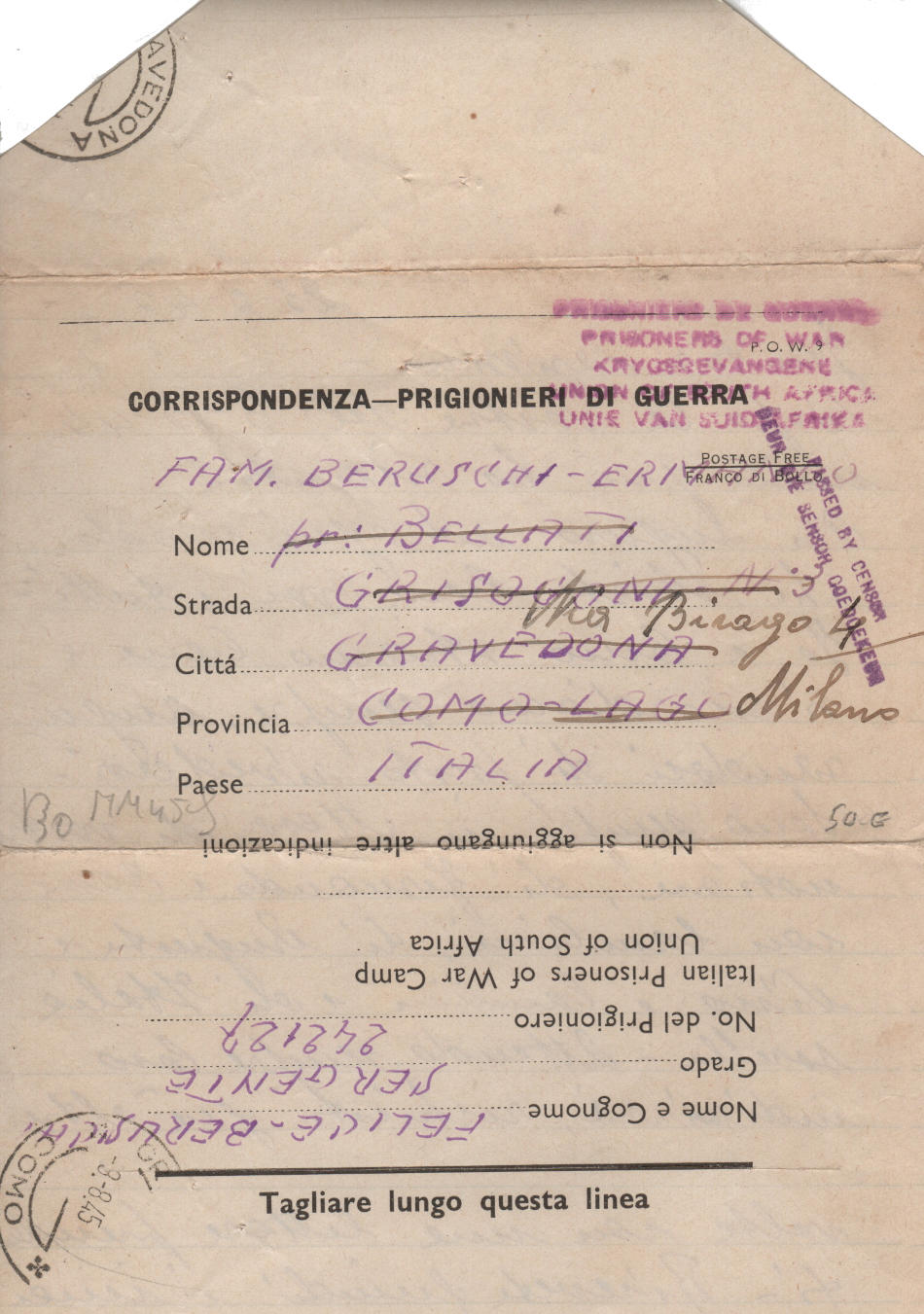 Lettera scritta il 23.3.1945 nel campo di prigionia e spedita a Gravedona (provincia di Como) quindi a Milano in Italia
