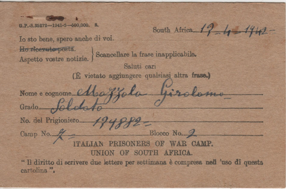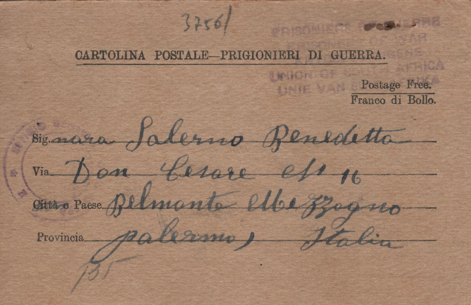 Cartolina scritta il 13.4.1942 nel campo di prigionia e spedita a Belmonte Mezzagno (provincia di Palermo) in Italia
