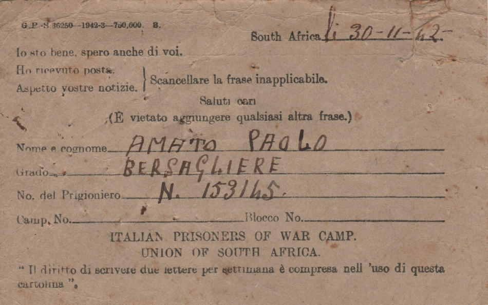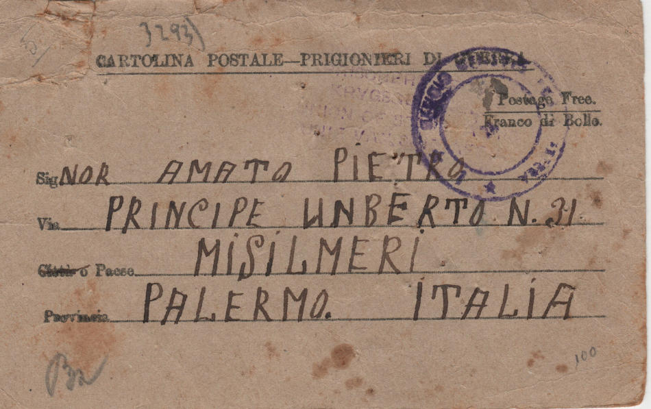 Cartolina scritta il 30.11.1942 nel campo di prigionia e spedita a Misilmeri (provincia di Palermo) in Italia