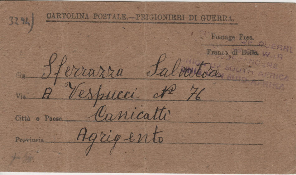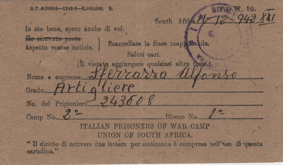 Cartolina scritta l'11.12.1942 nel campo di prigionia e spedita a Canicatti (provincia di Agrigento) in Italia