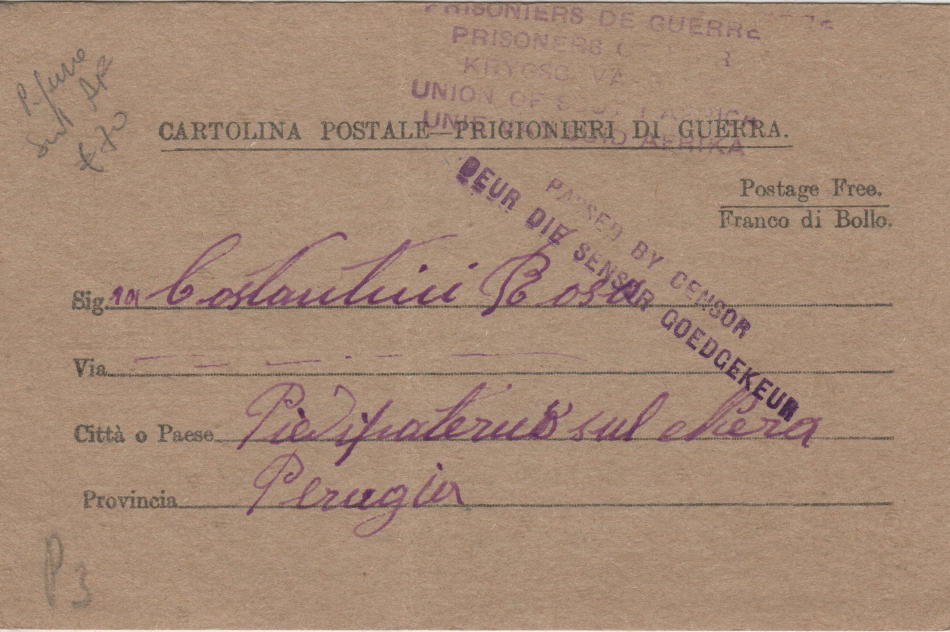 Cartolina scritta l'8.2.1942 nel campo di prigionia e spedita a Piedipaterno sul Nera, provincia di Perugia (Italia)