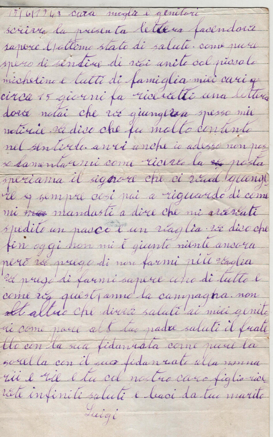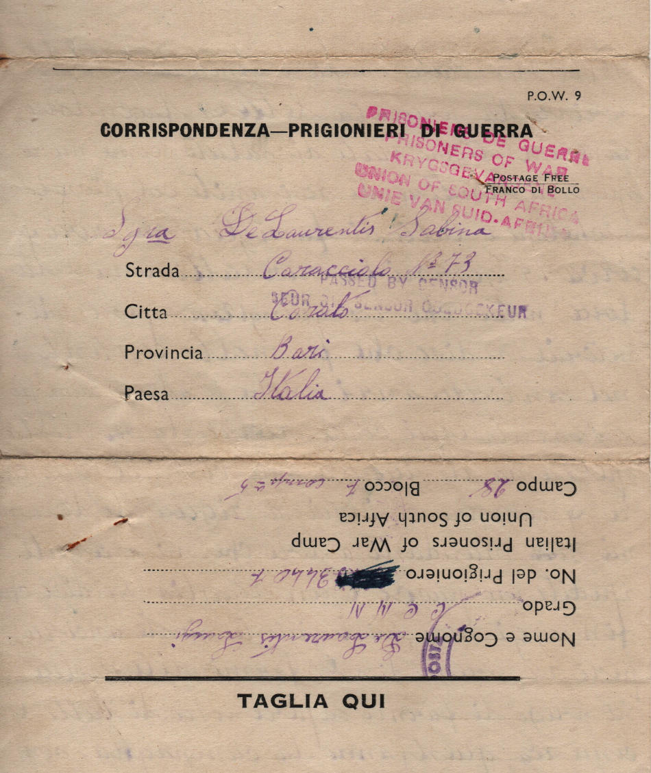 Lettera scritta il 15.6.1943 nel campo di prigionia e spedita a Corato (provincia di Bari) in Italia