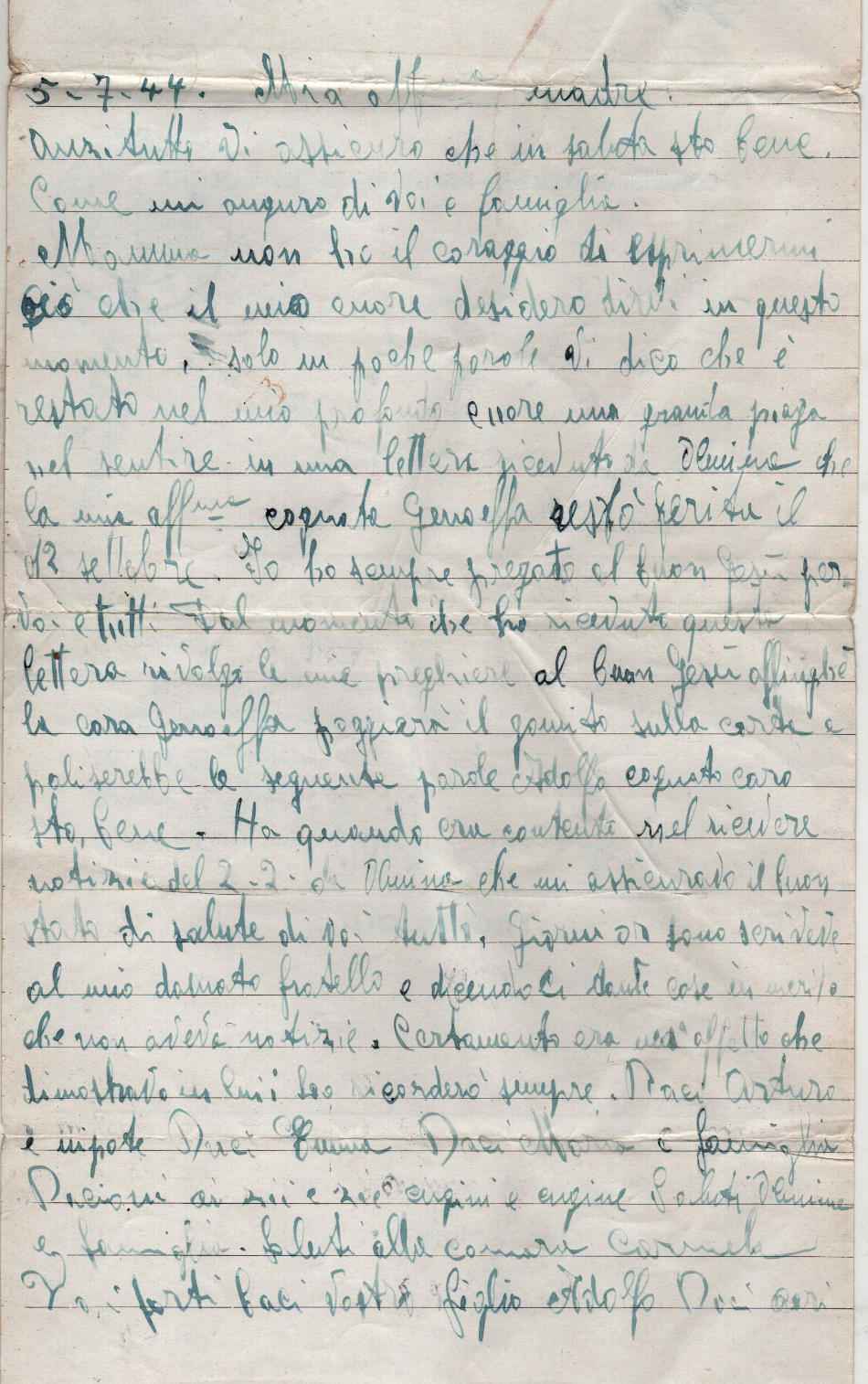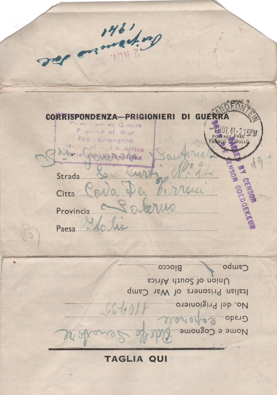 Lettera scritta il 5.7.1944 nel campo di prigionia e spedita a Cava de’ Tirreni (provincia di Salerno) in Italia