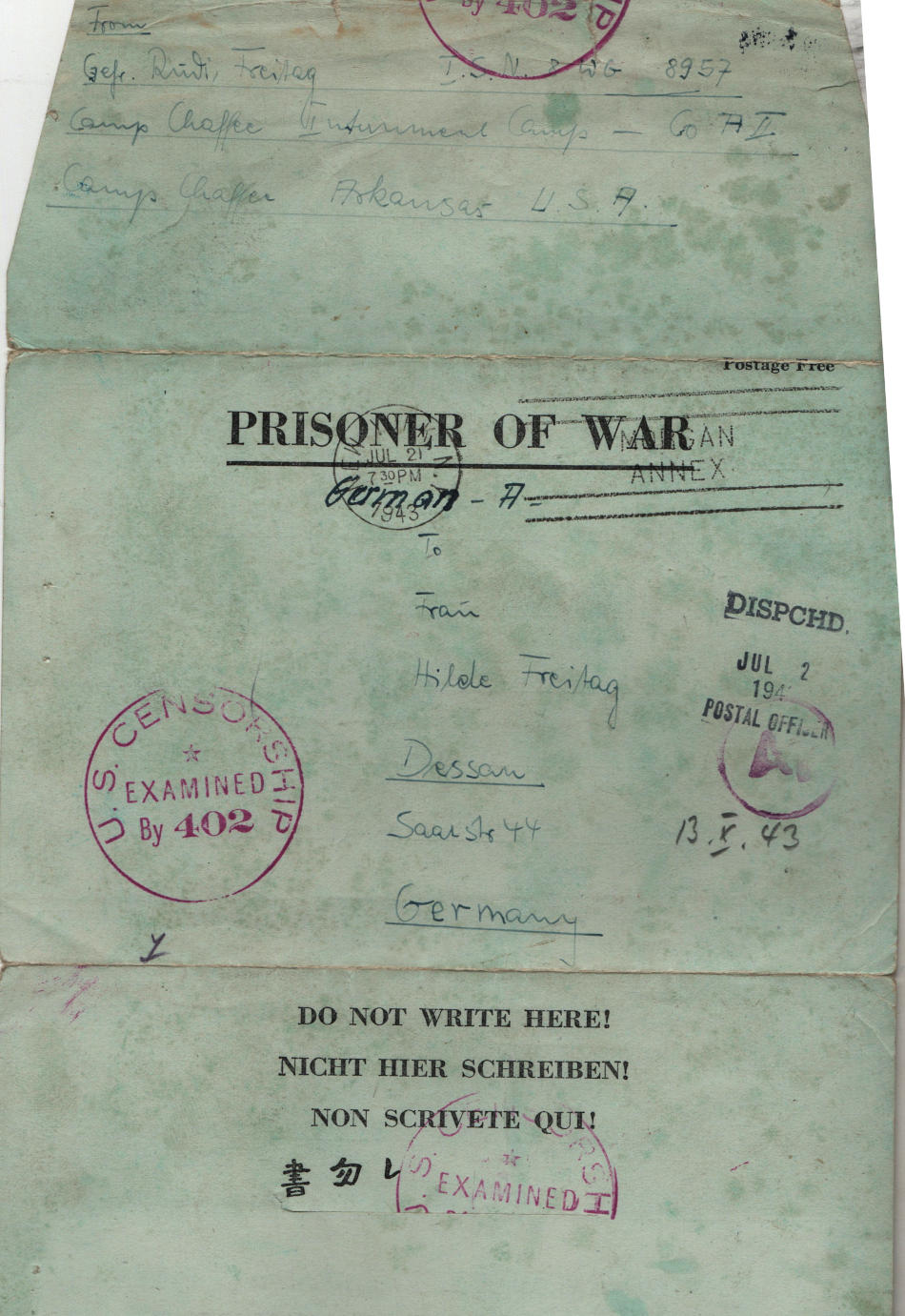 Lettera scritta il 2.7.1943 nel campo di prigionia e spedita a Dessau (Sassonia-Anhalt) in Germania