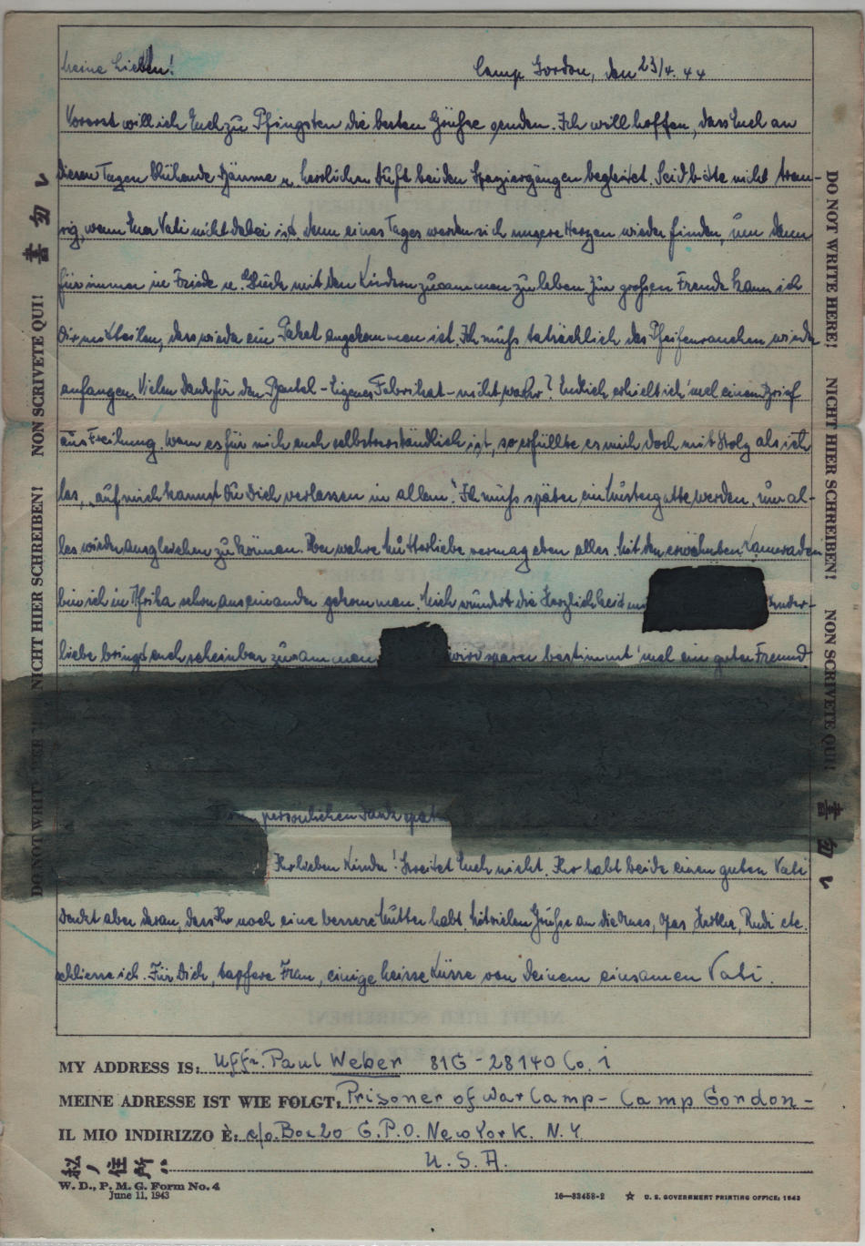 Lettera scritta il 23.4.1944 nel campo di prigionia e spedita ad Amburgo in Germania
