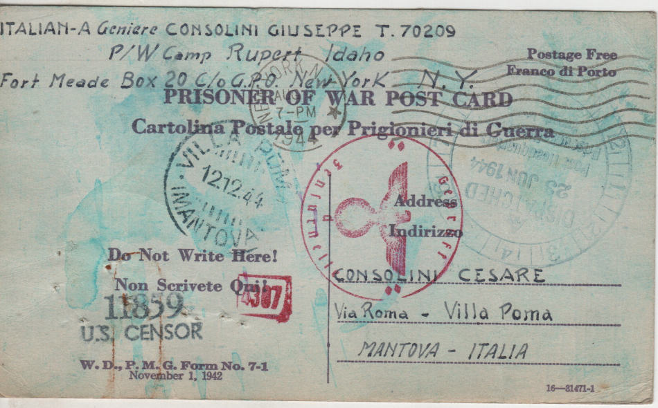Cartolina scritta il 23.6.1944 nel campo di prigionia e spedita a Mantova in Italia
