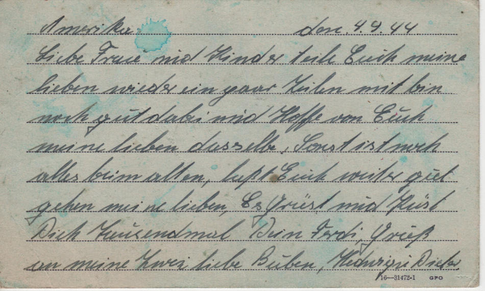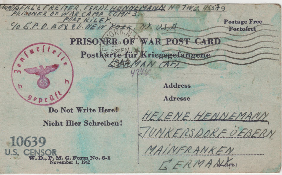 Cartolina scritta il 4.9.1944 nel campo di prigionia e spedita a Junkersdorf (ora Pfarrweisach) in Bassa Franconia (Germania)