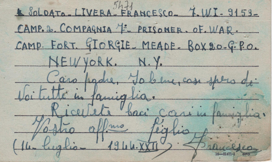 Cartolina scritta il 14.7.1944 nel campo di prigionia e spedita ad Agira (provincia di Enna) in Italia